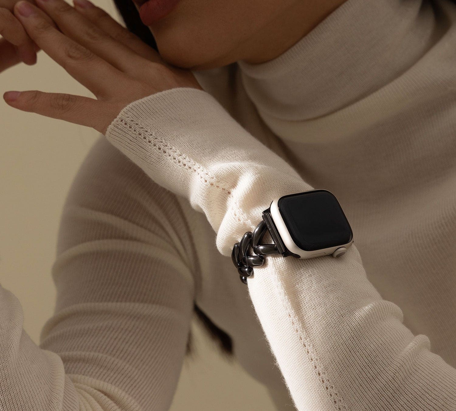 Epitomize luxury with our bold, metal chevron strap. Its robust chevron pattern merges into a delicate chain, available in an array of tones from sleek silver and mystic black to radiant gold and soft salmon, promising the perfect match for your boldest and most subtle outfits.